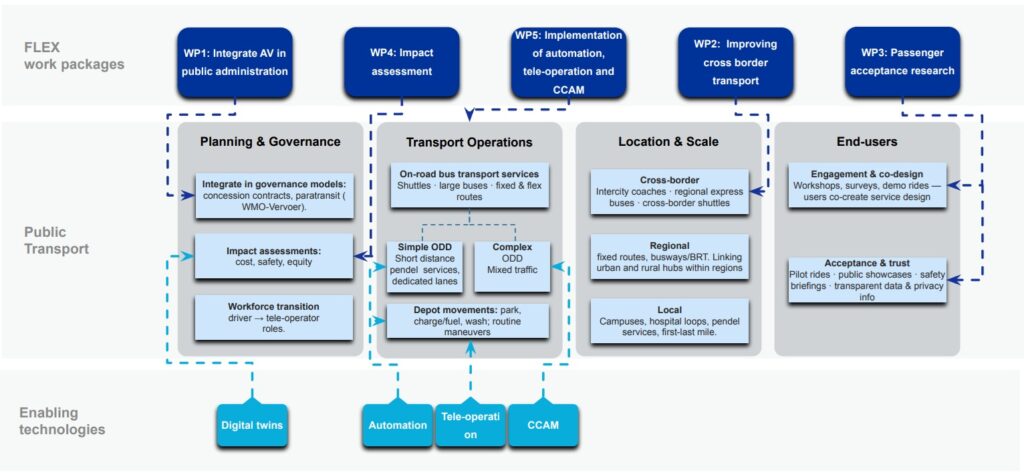 Darüber hinaus untersucht FLEX, wie AV in die Verwaltungsmodelle von Verkehrsbehörden integriert werden kann, um AV in größerem Umfang in den ÖPNV einzuführen.